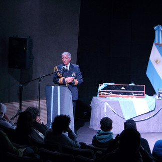 Luego de la proyección del documental, el Comodoro Orefice -que aportó a la conferencia una réplica del sable del General Belgrano- reflexionó acerca de la trayectoria del prócer. Así pudo recorrer los pasajes salientes de su vida académica en España, su llegada al Río de la Plata en 1794 como Secretario del Real Consulado (lugar desde el que inició el estudio de las artes, las ciencias y las letras en el país), su participación en las invasiones inglesas y en las Jornadas de Mayo y su ulterior derrotero militar. Destacó el Comodoro Orefice que Belgrano condujo operaciones militares y libró batallas en distintos teatros de operaciones en la búsqueda de nuestra emancipación, obteniendo resultados admirables, con victorias (por ejemplo, Salta y Tucumán) y derrotas (Vilcapugio y Ayohuma) que fueron forjando su carácter, espíritu militar y dotes de conductor.